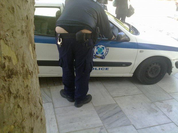 Αγαπητέ μου Πιτσιρίκο, σου στέλνω τι “έπιασα” σήμερα (Κυριακή) μεσημέρι στη Διονυσίου Αρεοπαγίτου. Παχουλός μπάτσος μιλάει με άλλους μέσα στο περιπολικό. Φοράει κάτι ανάμεσα σε τάνγκα και κιλότα; Τι να πω; Άντε και με στρινγκάκι! Φαντάζομαι ότι θα γελάσει λίγο ο πάσα πικραμένος, γι’ αυτό σου στέλνω τη φωτό.