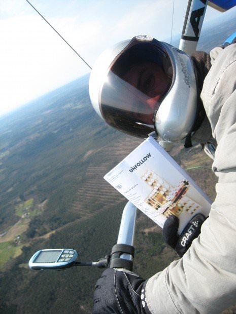 Γεια σου Πιτσιρίκο. Συνεχίζοντας την παράδοση που θέλει το Unfollow να διαβάζεται σε όλα τα πλάτη και μήκη της υφηλίου, προχωράω ενα βήμα πιο πέρα και ανεβάζω τον πήχη (στα 1100 μετρα) για τους επόμενους αναγνώστες που θα στείλουν φωτό. Έτσι λοιπόν έβγαλα casually το αγαπημένο μου περιοδικό και άρχισα να ξεφυλλίζω λίγο κατά τη διάρκεια της πτήσης πάνω απο τις όμορφες πεδιάδες της Σουηδίας. Δυστυχώς ο αετός παίρνει μόνο ένα ατομο, το οποίο πρέπει -εκτος των αλλων- να πιλοτάρει. Εγώ αντίθετα αποροφήθηκα απο την εκπληκτική ύλη του περιοδικού και ξέχασα να πιλοτάρω τον αετό. Περιττό να σου πω οτι βγήκε εκτός ελέγχου και κατέπεσε με αποτέλεσμα να βρω άμεσο θανατο. Ας είναι, ένας στο χώμα κτλ κτλ. Φιλικά, Γιώργος (Αγαπητέ Γιώργο, σε ευχαριστούμε πολύ που -μέσα στην κόλαση της ξενιτιάς που βλέπω ότι ζεις- μας θυμήθηκες. Τώρα περιμένω αυτόν που θα στείλει φωτογραφία με το Unfollow στο βυθό της θάλασσας – δίπλα στο γιούσουρι.)