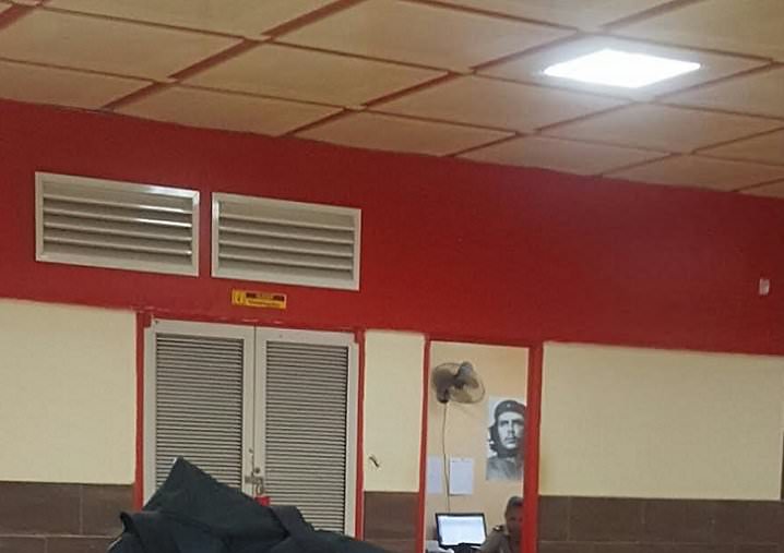 Στο βάθος της αίθουσας ανοίγει μία πόρτα. Μία υπάλληλος κάθεται στο γραφείο της και πίσω της βρίσκεται κρεμασμένη στο τοίχο μία εικόνα του Che Guevara.