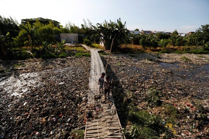 Πιτσιρίκο, με τη φωτογραφία δύο παιδιών πάνω σε μία ξύλινη και ετοιμόρροπη γέφυρα, ενός ποταμού τα νερά του οποίου δεν φαίνονται από τα σκουπίδια, το Reuters γράφει για την προσπάθεια της Ινδονησίας να μειώσει κατά 70% την πλαστική ρύπανση ως το 2025, διαθέτοντας 1 δισ. δολάρια ετησίως.