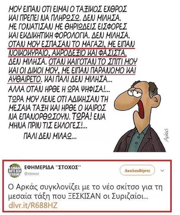 Ακόμα και -ξαναλέω- αν δεν εννοούσε τον Ζακ και μιλούσε γενικά και αόριστα για τα πάθη της μεσαίας τάξης και πάλι, η ελληνική “μεσαία” τάξη είναι το πρόσωπο του τέρατος.
