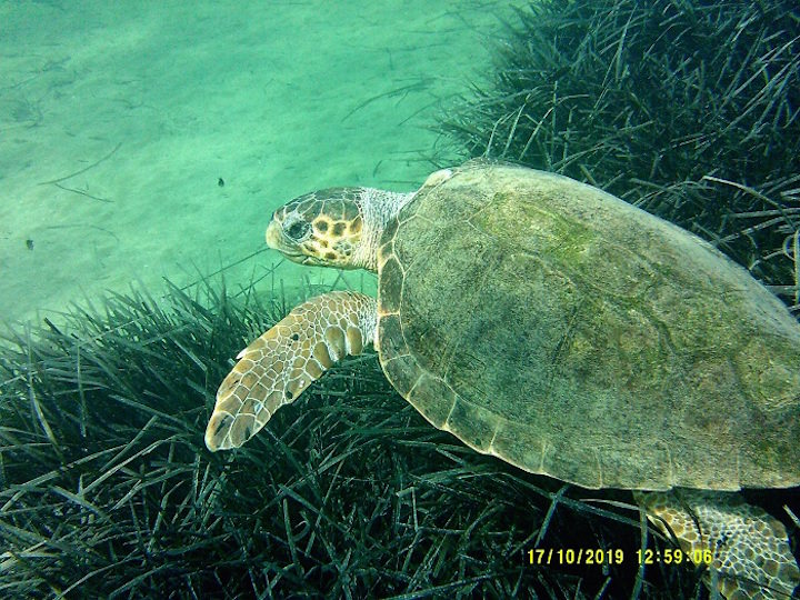 Προσπαθεί να απομακρυνθεί και να βγει στον αφρό σε κάποια απόσταση ασφαλείας. Οπότε, μετά από κάποια λεπτά, σταμάτησα να την ακολουθώ και έμειναν πια πίσω της μόνο τα μελανούρια και οι σαργοί, που τη συνόδευαν και όταν ήταν στον βυθό.