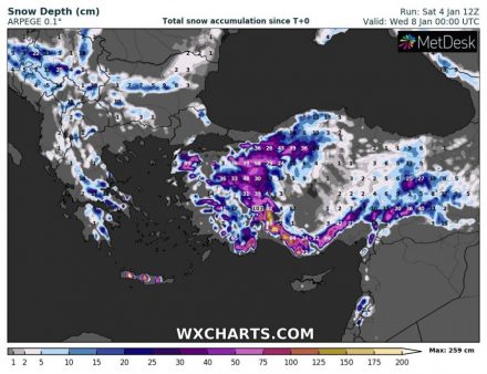 Στα νότια – νοτιοδυτικά Βαλκάνια τα ύψη του χιονιού θα φτάσουν τα 20 με 40 εκατοστά, στην Τουρκία τα 40 με 80 εκατοστά, ενώ στα βουνά της στα νοτιοδυτικά ίσως πέσουν και 100 με 200 εκατοστά φρέσκου χιονιού.