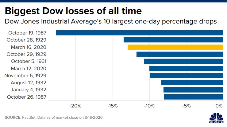Στο top-10 των χειρότερων ημερών για τα αμερικανικά χρηματιστήρια, οι δυο είναι η 12/3 και χθες όταν ο Dow Jones έπεσε 13%. Οι άλλες 8 μαύρες μέρες για τα αμερικανικά χρηματιστήρια είναι όλες στο 1987 και στο διάστημα 1929-1932.