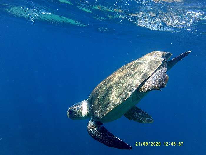 Με το σαν να πετάει κολύμπι της στο απέραντο γαλάζιο ξεχώριζε ανάμεσα στα μελανούρια, τις καλόγριες, την αθερίνα και τις γόπες, αλλά και μία μικρή σουπιά που κάθισε για λίγο δίπλα της στην ποσειδωνία.