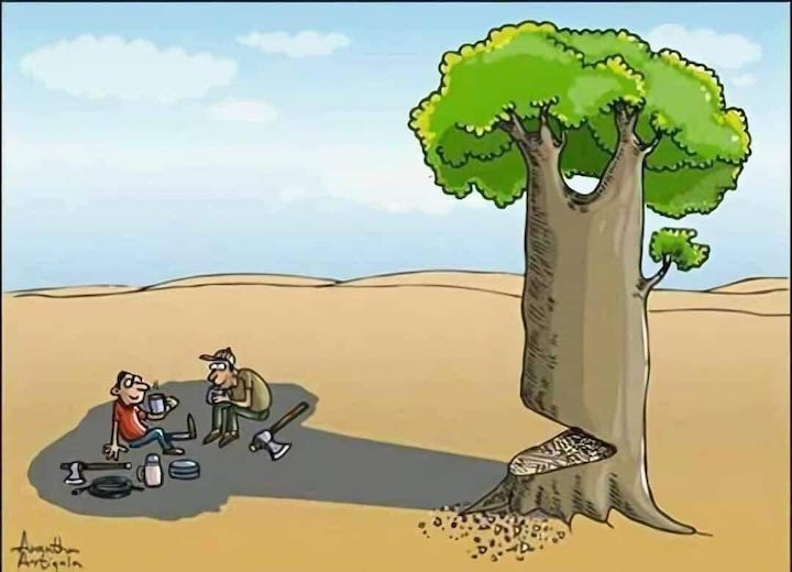 Υ.Γ.3 Σαν τους τύπους στην γελοιογραφία, απολαμβάνουμε την σκιά του μοναδικού δέντρου που ετοιμαζόμαστε να κόψουμε.