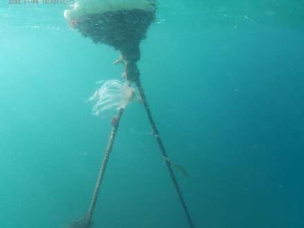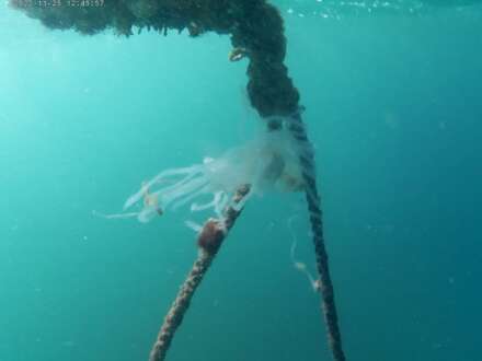 Επειδή το κυματάκι θα έβγαζε το σχοινί στη στεριά, το σφήνωσα κάτω από ένα βράχο στον βυθό, μήπως και εκκολαφθούν τα καλαμαράκια.
