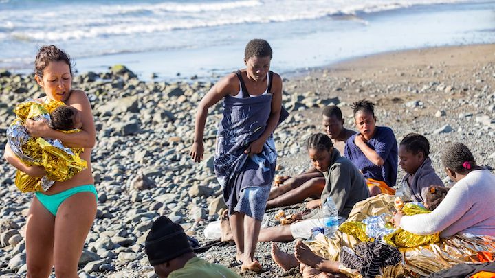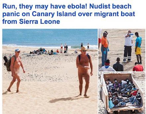 (Αγαπητέ φίλε, σε τουριστικές χώρες, όπως η Ισπανία και η Ελλάδα, θα πρέπει οι κυβερνήσεις και η τοπική αυτοδιοίκηση να αποφασίσουν αν στις πόλεις και στις παραλίες έχουν προτεραιότητα οι κάτοικοι αυτών των χωρών ή οι τουρίστες. Στην Ελλάδα, σε πολλές περιοχές της χώρας -και κυρίως στα νησιά-, η απόφαση έχει παρθεί και είναι προφανές πως μόνο οι τουρίστες έχουν σημασία. Στην Μαγιόρκα, πριν από μερικά χρόνια, οι τοπικές αρχές αποφάσισαν να γκρεμίσουν κτίρια, για να θυμίζει το νησί πως είναι νησί. Ας το σκεφτούν αυτό οι “επιχειρηματίες” των ελληνικών νησιών, που τα ξεσκίζουν, λες και δεν υπάρχει αύριο. Είναι πολύ συνηθισμένο να φτάνουν Αφρικανοί μετανάστες στα Κανάρια Νησιά, και συμβαίνουν και διάφορα περίεργα, όπως όταν οι μετανάστες φτάνουν αποκαμωμένοι με τις βάρκες τους σε παραλίες γυμvιστών. Αυτή η φωτογραφία είχε κάνει τον γύρο του Διαδικτύου, και πλαισιωνόταν, φυσικά, και από φοβικά σχόλια.