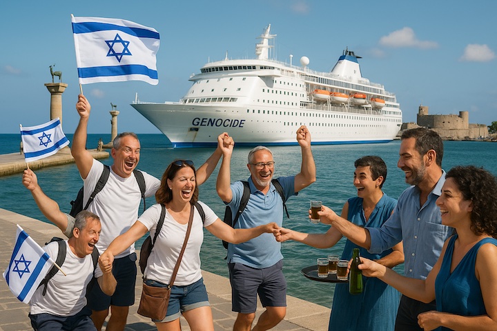 Η Ελλάδα απέδειξε για μια ακόμα φορά την αταλάντευτη δέσμευσή της στον ανθρωπισμό, τη Δημοκρατία, την φιλοξενία και το καλωσόρισμα με μπακλαβαδάκι, αφού στη Ρόδο 660 τουρίστες από το Ισραήλ αποβιβάστηκαν χαρούμενοι από το κρουαζιερόπλοιο “Genocide” και έκαναν καρδούλες με τα ματωμένα χεράκια τους, σαν να είχαν έρθει για Εrasmus, και σαν να μην είναι πολίτες -και στρατιώτες- μιας χώρας που κατηγορείται από το Διεθνές Ποινικό Δικαστήριο για γενοκτονία και εγκλήματα πολέμου.