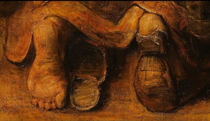 Με εμφανή τα σημάδια της ταλαιπωρίας ο άσωτος γιος γονατίζει μπροστά στον πατέρα. Ο χιτώνας του φθαρμένος, το ένα παπούτσι δίπλα στο σκληρό και βρώμικο πόδι του, το άλλο έχει τρυπήσει στη φτέρνα. Μοναδικό ίχνος της ευγενούς καταγωγής του το κοντό σπαθί στη δεξιά του πλευρά. Το κεφάλι του ξυρισμένο, θυμίζει φυλακισμένο χωρίς ταυτότητα. Ή μήπως μωρό νεογέννητο; Αυτός ο γιος ξαναγεννιέται. Ακολουθώντας το μονοπάτι της ταπεινότητας και του θάρρους επιστρέφει και εκθέτει τα κουρέλια του στο φως. Είναι το φως που πηγάζει από το πρόσωπο του πατέρα, το φως της συγχώρεσης και της αγάπης που τον αγκαλιάζει.