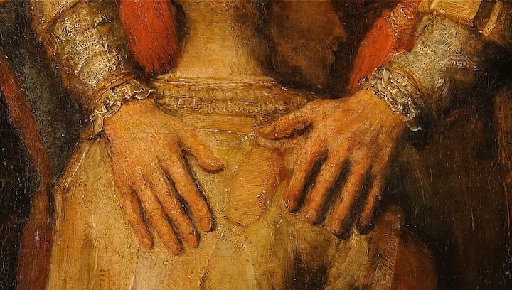 ‘’Η μορφή του πατέρα, που καλύπτεται από έναν κόκκινο μανδύα, υπερτερεί. Αγκαλιάζει τον μικρότερο γιο του, που είναι γονατιστός μπροστά του, με ξυρισμένο το κεφάλι και φθαρμένα ρούχα. Ο άσωτος γιος είναι ζωγραφισμένος από πίσω σαν το είναι του να παραδίδεται ανεπιφύλακτα στην αγάπη του πατέρα. Τα χέρια του πατέρα δεν εκφράζουν τη συμβολική εξουσία του Νόμου, δεν είναι τα χέρια αυτού που τιμωρεί ή αυτού που απαιτεί να οδηγήσει τη ζωή του παιδιού του. Μια ασυμμετρία τα καθιστά αινιγματικά: Το ένα χέρι είναι αντρικό και το άλλο καθαρά γυναικείο. Ο πατέρας που καλωσορίζει την επιστροφή του γιου του δεν είναι ο πατέρας του Νόμου, αλλά της αναστολής του, δηλαδή της ύπαρξης ενός άλλου Νόμου- του Νόμου της αγάπης- που διακόπτει την εφαρμογή του αμείλικτου Νόμου της μοίρας, καθιστώντας δυνατό ένα νέο ξεκίνημα. Τα χέρια του πατέρα στην πλάτη του παιδιού είναι χέρια που δεν κρατούν ραβδί ή κώδικες. Είναι τα ανοιχτά χέρια της συγχώρεσης: Ο πατέρας αποδεικνύεται μητέρα στην πράξη της συγχώρεσης γιατί αρνείται την άσκηση του Νόμου, στο όνομα ενός άλλου Νόμου που είναι αυτός της αγάπης. Αυτός ο άλλος Νόμος βρίσκεται ενσαρκωμένος στο μητρικό χέρι του πατέρα του Ρέμπραντ… Τα χέρια που υποδέχονται τη ζωή που φωνάζει, που τη γλιτώνουν από την ανημπόρια , από την εμπειρία της απόλυτης εγκατάλειψης, είναι τα χέρια της μητέρας.’’