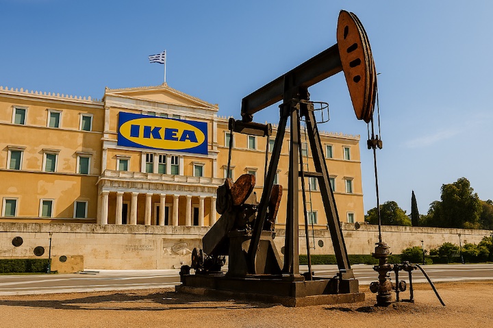Παράλληλα, για τις πετρελαϊκές εταιρείες και τη σουηδική πολυεθνική, πρότεινε μακέτα διαμόρφωσης του χώρου μπροστά στη Βουλή, με το λογότυπο της IKEA στην πρόσοψη του κτιρίου, και χώρο άντλησης πετρελαίου εντός του πλαισίου που απεικονίζεται στην κάτοψη.
