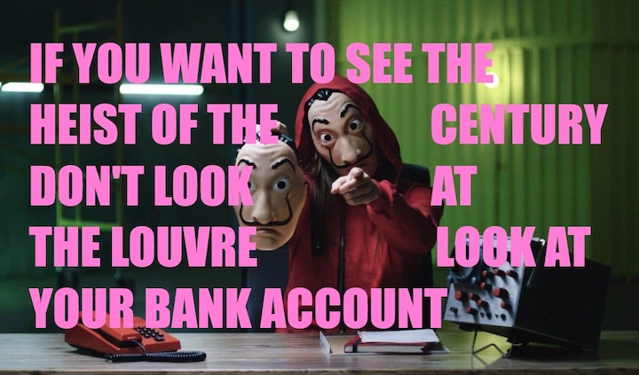 Η χολιγουντιανή κατήχηση τραβά την προσοχή του κοινού, ενώ οι κυβερνήσεις εκμεταλλεύονται τις σκιές από τα φώτα της δημοσιότητας στον άρτο και το θέαμα για να εφαρμόσουν το πλιάτσικο τους στις ζωές μας και το μέλλον αυτού του κόσμου. “Ληστεία” είναι, λοιπόν, η κλοπή από ένα ρατσιστικό αυτοκρατορικό αποικιοκρατικό απολειφάδι, όπως είναι το μουσείο του Λούβρου, αλλά το ότι ο Jeff Bezos έχει να πληρώσει φόρους καμιά εικοσαετία την ώρα που κερδίζει δισεκατομμύρια μέσω της εκμετάλλευσης των εργαζομένων στα εργοστάσια της Amazon στη Γαλλία και αλλού στον κόσμο, είναι απλά Τρίτη.