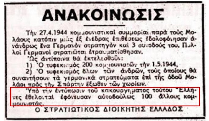 −Η γερμανική διοίκηση Αθηνών διατάζει ένα τμήμα της 117ης Μεραρχίας Καταδρομών του υποστρατήγου Karl Von Le Suire, να κινηθεί προς τους Μολάους και να προβεί σε πράξεις αντιποίνων ‘’κατά την κρίση τους’’. Κι επειδή η 117η Μεραρχία ήταν η μονάδα που, μόλις 4 μήνες πριν, ‘’επιμελήθηκε’’ του ολοκαυτώματος στα Καλάβρυτα, όλοι καταλαβαίνουμε ποια ακριβώς θα ήταν η ‘’κρίση’’ τους.