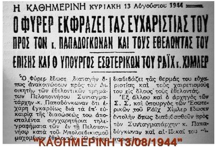 Στις 20/7/1944 έγινε απόπειρα δολοφονίας κατά του Χίτλερ, η οποία απέτυχε. Αυτή τη φορά, ο Παπαδόγγονας ενθουσιάστηκε τόσο πολύ, ώστε έστειλε συγχαρητήριο τηλεγράφημα στον ‘’Φύρερ’’ (μάλλον ήταν κι αυτός ‘’φίλος’’του). Ετσι, στο κυριακάτικο φύλλο της εφημερίδας ‘’Καθημερινή’’ με ημερομηνία 13/8/1944 (μόλις 4 μέρες πριν από το μπλόκο της Κοκκινιάς που πραγματοποίησαν τα Τάγματα Ασφαλείας) βρίσκουμε την παρακάτω δημοσίευση.