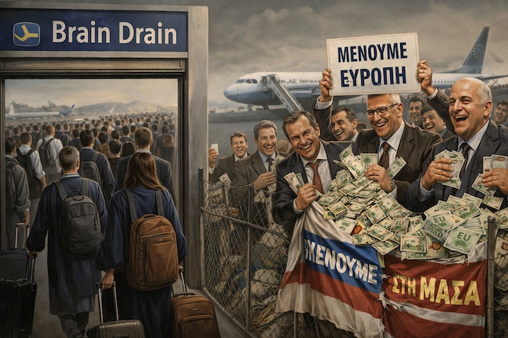 Σκεφτείτε για λίγο όλους αυτούς τους εκατοντάδες χιλιάδες Έλληνες με τα πτυχία και τα ντοκτορά που αναγκάστηκαν να φύγουν από την Ελλάδα για να μπορέσουν να ζήσουν με αξιοπρέπεια, και βλέπουν όλα αυτά τα χρόνια τους Λαζαρίδηδες, τους Φραπέδες και τους Χασάπηδες να κάνουν πάρτι και να τρώνε με χρυσά κουτάλια.