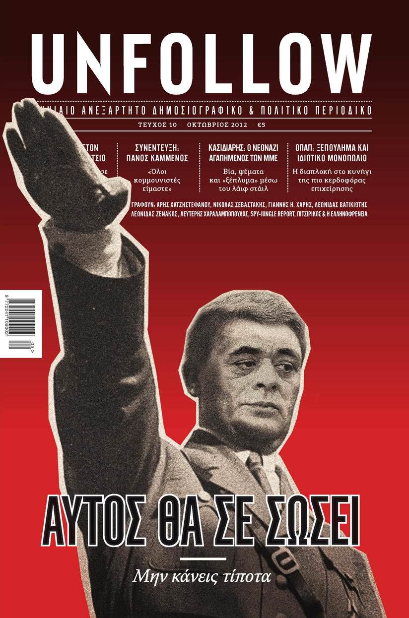 Το UNFOLLOW είναι ένα μηνιαίο, ανεξάρτητο, δημοσιογραφικό και πολιτικό περιοδικό που θα κυκλοφορήσει στα περίπτερα την Τετάρτη 14 Δεκεμβρίου. Συμμετέχω σε αυτήν την προσπάθεια για ένα και μόνο λόγο: Κουράστηκα και βαρέθηκα να ακούω τους πάντες -κι εμένα μαζί- να κατηγορούν τα καθεστωτικά ΜΜΕ και να γκρινιάζουν συνέχεια αλλά να μην κάνουν καμία προσπάθεια να […] Διάβασε τη συνέχεια